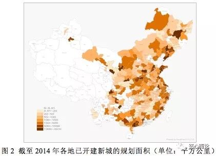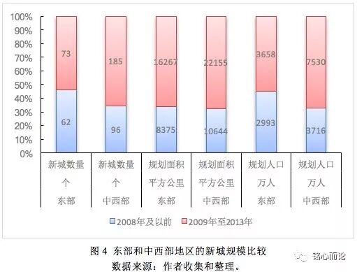 3.1 新城建设低效 由于建设用地指标行政性配置方向未能和人口流动方向保持一致,中西部地区的土地供应较东部更加充足,地方政府在征收农地时价格相对低廉;而现行的体制和地方融资平台的国企特性,也促使地方政府敢于借债,商业银行敢于放款、积极放款。过剩的土地供应、过低的征地成本、充足的资金供给共同导致中西部省份地方政府规划的新城新区更加粗放,存在规格过高、规模过大、个数过多、密度过低、与主城区距离过远等问题。